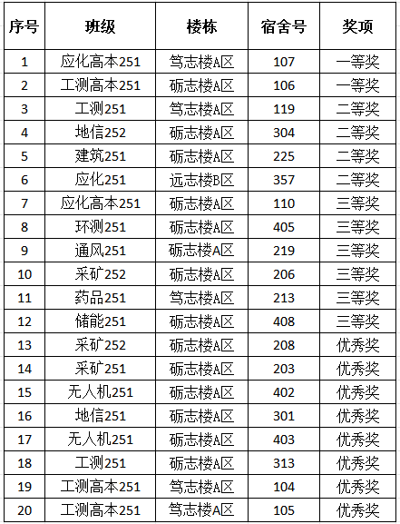 经过三轮评比,最终评选出一等奖宿舍两间,二等奖宿舍四间,三等奖宿舍六间,优秀奖宿舍八间(获奖情况见下表)。