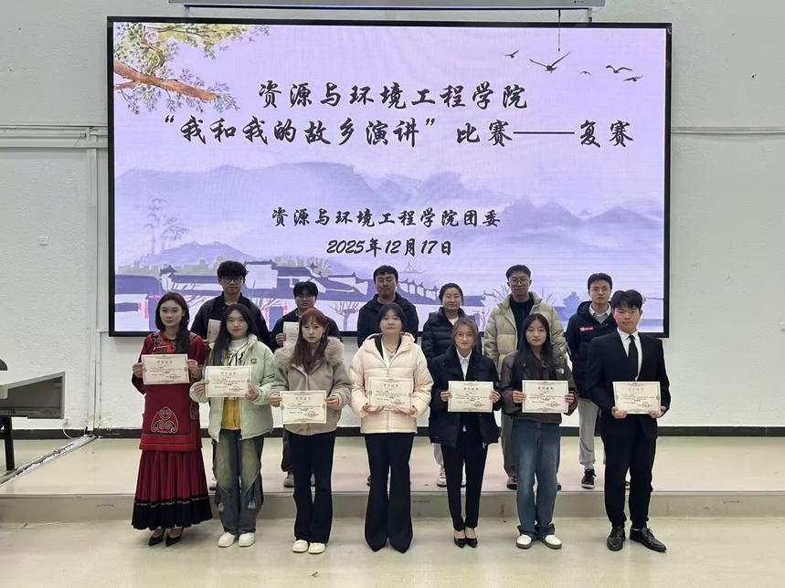 为深化爱国主义教育,厚植家国情怀,资源与环境工程学院团委于2025年12月18日在尚学楼A1—19成功举办“我和我的故乡”演讲比赛。