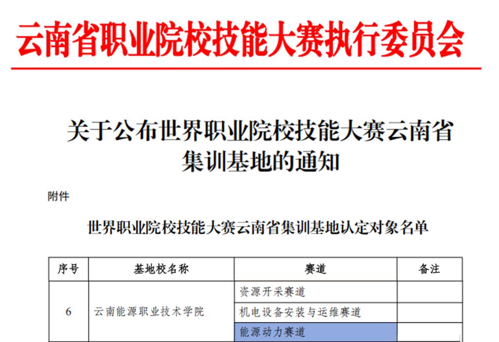 近日,云南省职业院校技能大赛执行委员会公布世界职业院校技能大赛云南省集训基地认定对象名单,我校被遴选为世界职业院校技能大赛云南省集训基地,机械与电气工程学院承担“机电设备安装与运维”与“能源动力”2个赛道集训工作。