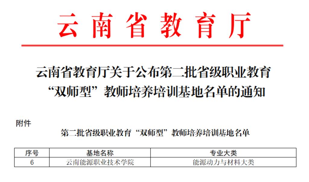 近日,云南省教育厅公布第二批省级职业教育“双师型”教师培养培训基地名单,机械与电气工程学院申报的“能源动力与材料大类”基地成功入选第二批省级职业教育“双师型”教师培养培训基地。