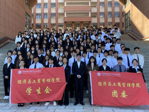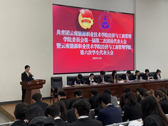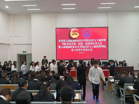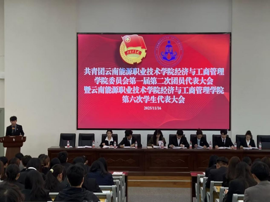 经济与工商管理学院团委第一届第二次团员代表大会暨学生委员会第六次学生代表大会于2025年11月16日下午在H2-05阶梯教室胜利召开。学院团委书记张栩荣、副书记王黄倚君,学生会、艺术团指导教师杨里煜出席了本次会议。会议共有学生代表124名、团员代表70名参加。