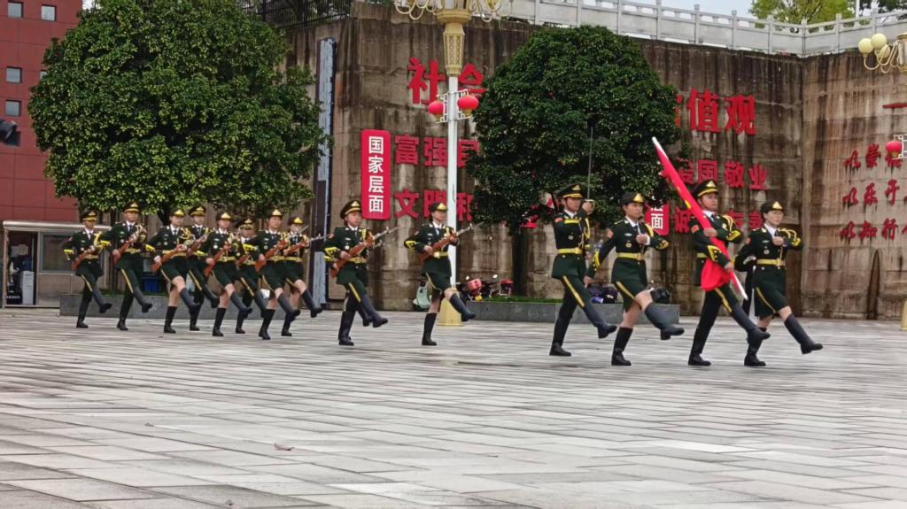上午8时整,升旗仪式正式开始。国旗护卫队队员迈着铿锵有力的步伐,护卫五星红旗庄严入场。在雄壮的国歌声中,鲜艳的五星红旗冉冉升起,全体师生肃立注目,齐声高唱国歌,表达对祖国的深切热爱与崇高敬意。