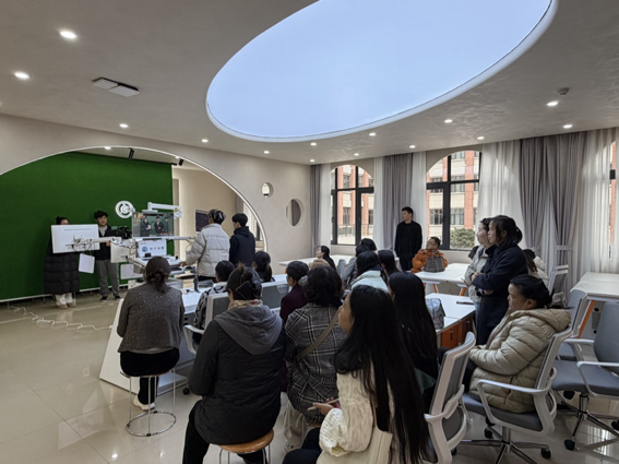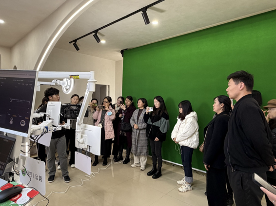当日下午,临江社区学员们受到人文与艺术设计学院、经济与工商管理学院的热烈欢迎。在人文与艺术设计学院院长岳梦雯、副院长秦贇、经济与工商管理学院副院长钱欣、广告艺术设计专业王小密老师的陪同下,学员们实地探访了数智化新媒体营销运营实训中心。实训室内,专业级摄像机、标准化灯光系统、专业声学处理设备、虚拟演播场景及高清导播台等硬件设施一应俱全,尤其是融合广告视觉设计、直播脚本策划、营销数据监测的一体化实训平台,让聚焦就创业的学员们展现出强烈的学习热情。