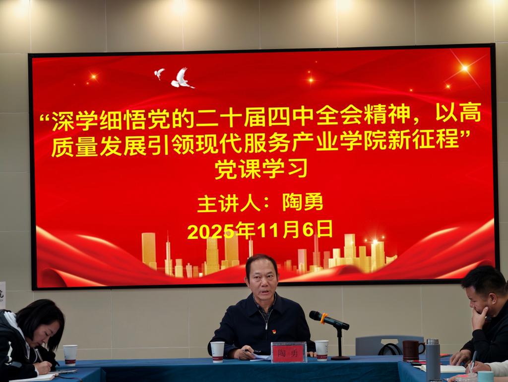 2025年11月6日,学校党委委员、副校长陶勇以“深学细悟党的二十届四中全会精神,以高质量发展引领现代服务产业学院新征程”为主题,为学院全体教职工讲授专题党课。