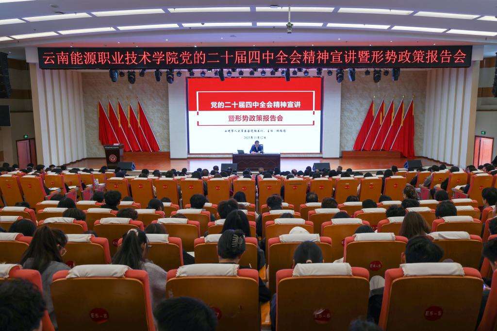11月12日,曲靖市人大常委会党组书记、主任杨经德到我校宣讲党的二十届四中全会精神并作形势政策报告。报告会由学校党委副书记、校长陈智刚主持,学校党委委员、各二级学院党组织书记,思政课教师,学生代表共计460余人参加了报告会。