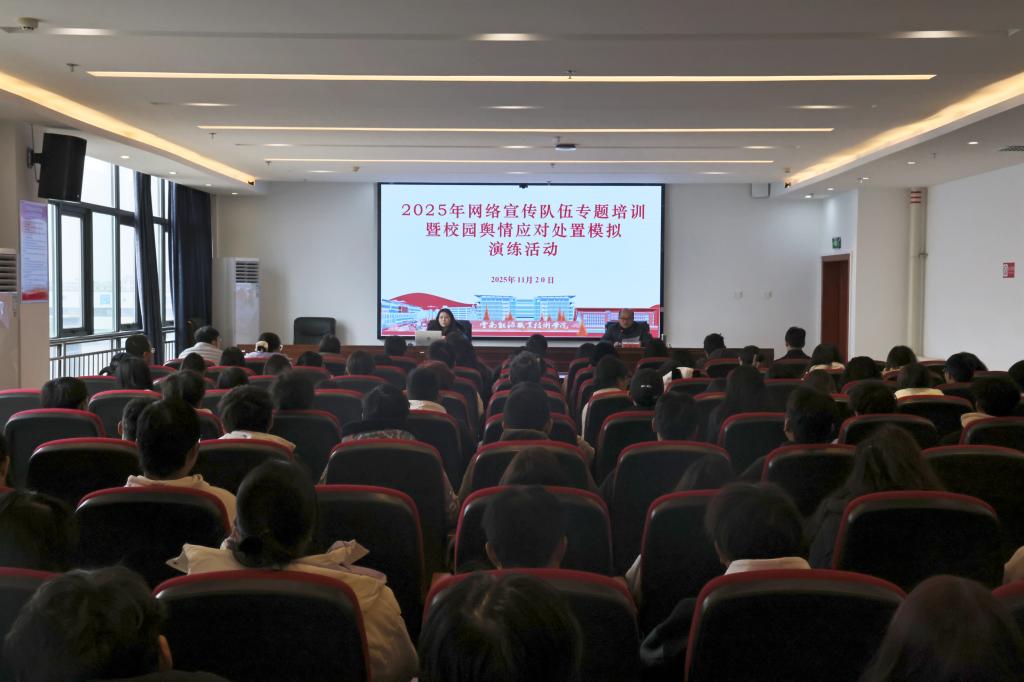 2025年11月20日,学校在麒麟校区图书馆5-3会议室开展网络宣传队伍专题培训暨校园舆情应对处置模拟演练活动。各基层党组织宣传委员、各部门网站和微信公众号管理人员、校记者团学生、校史馆讲解团学生共90余人参加活动。活动由学校党委副书记史祝云主持。