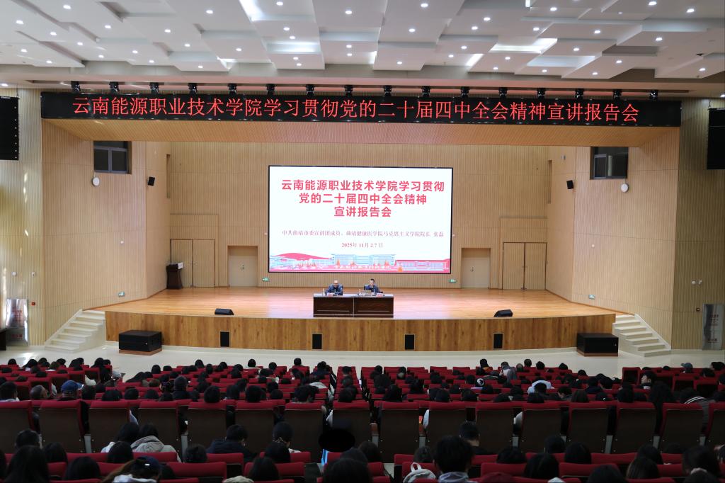 11月27日,学习贯彻党的二十届四中全会精神市委宣讲团报告会在我校沾益校区图书馆报告厅举行,市委宣讲团成员、曲靖健康医学院马克思主义学院院长张磊作宣讲报告。报告会由学校党委副书记史祝云主持,全体中层干部、师生代表共计580余人现场聆听学习。