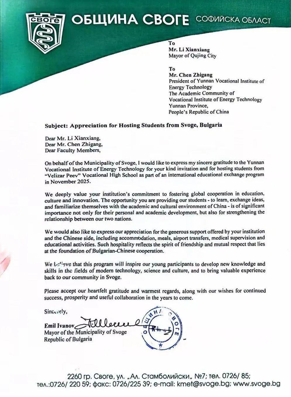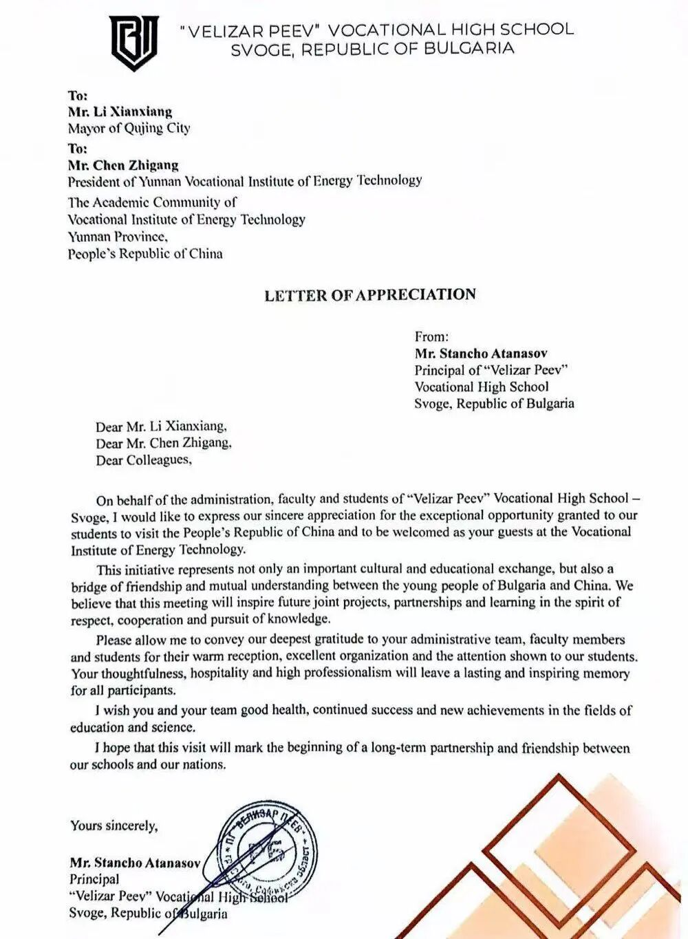 此次交流活动收获了来自欧洲方面的积极反馈。欧洲代表团所在的保加利亚城市市长特别向曲靖市市长发来感谢信,代表团所属学校也向云南能源职业技术学院致信,对中方在推动中欧职业教育合作、促进人文交流方面所做的努力表示诚挚感谢。