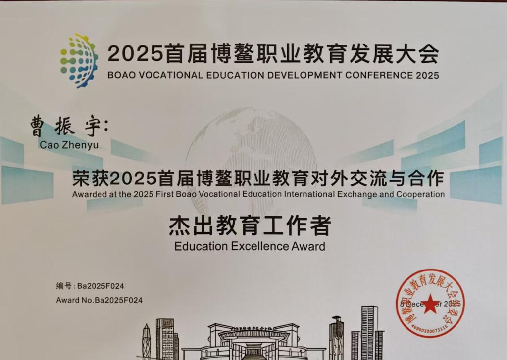学校招生就业处(对外合作交流中心)处长曹振宇凭借在对外交流合作工作中的突出表现,荣获“2025首届博鳌职业教育对外交流与合作杰出教育工作者”称号。多项荣誉的背后,是学校深耕职业教育国际化、推进产教深度融合的不懈努力,也是行业对学校办学成效与个人工作实绩的高度认可。