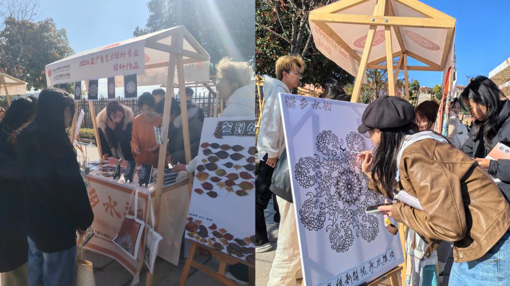 2025年12月12日,我校沾益校区樱花大道化身创意秀场,2026届广告艺术设计专业毕业设计展在此启幕。本次展览以“博源造物·爨地新集市”为主题,打破传统展览的呈现形式,将毕业设计与沉浸式文创市集深度融合,为师生带来一场兼具专业度与趣味性的视觉盛宴。