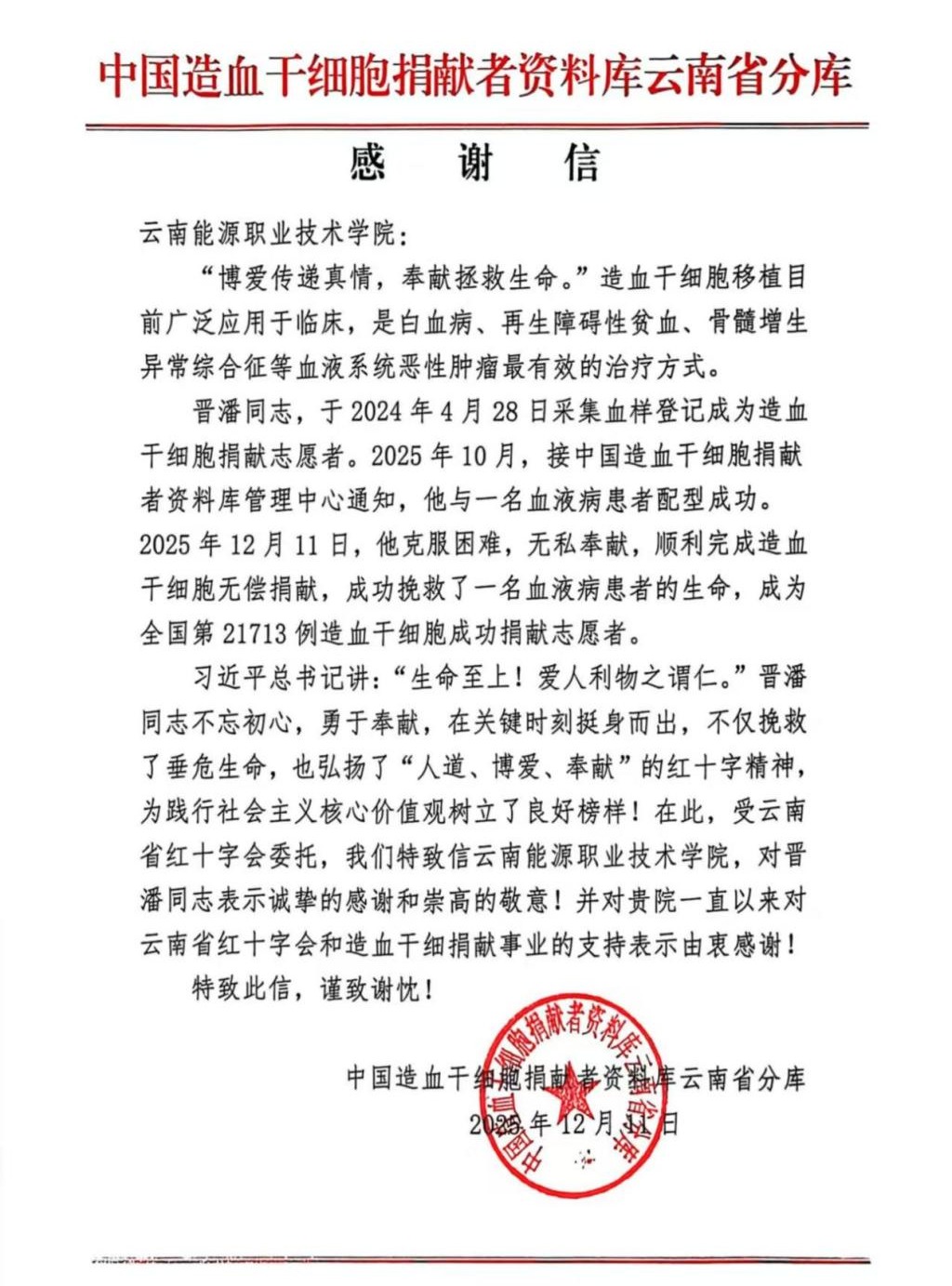 近日,现代服务产业学院涌现出一名以热血践行使命、以奉献点亮生命的先进榜样——烹饪234班学生晋潘。他于2025年12月11日自愿成功完成造血干细胞捐献,成为云南省第511例捐献者。