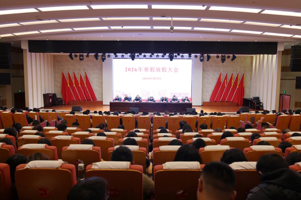 寒假将至,为扎实复盘本学期工作,安排部署下一年重点任务,统筹假期安全管理与服务工作。1月15日,学校在麒麟校区报告厅召开2026年寒假放假大会,学校全体教职工参加,大会由学校党委副书记、校长陈智刚主持。