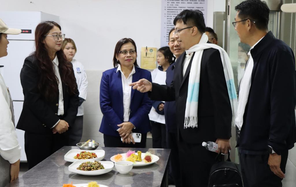 泰国吞武里职业学院校长 Krittiya Wanghom 对我校办学成果给予高度赞誉,她肯定了双学历项目的合作价值,更明确表达了与我校携手同行、协同发展的坚定意愿。现场提及的4名泰国留学生,如今已完全融入校园生活,他们不仅在烹饪专业领域精进技能,更主动化身中泰文化交流的“小使者”,用真诚与热情搭建起两国师生心灵相通的桥梁。