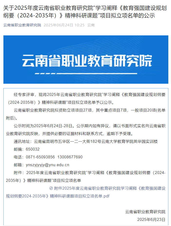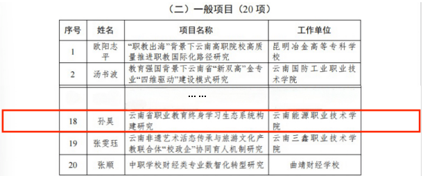6月23日,云南省职业教育研究院2025年度研究课题立项名单公示,全省拟资助立项项目27项,我院获一般项目立项1项。