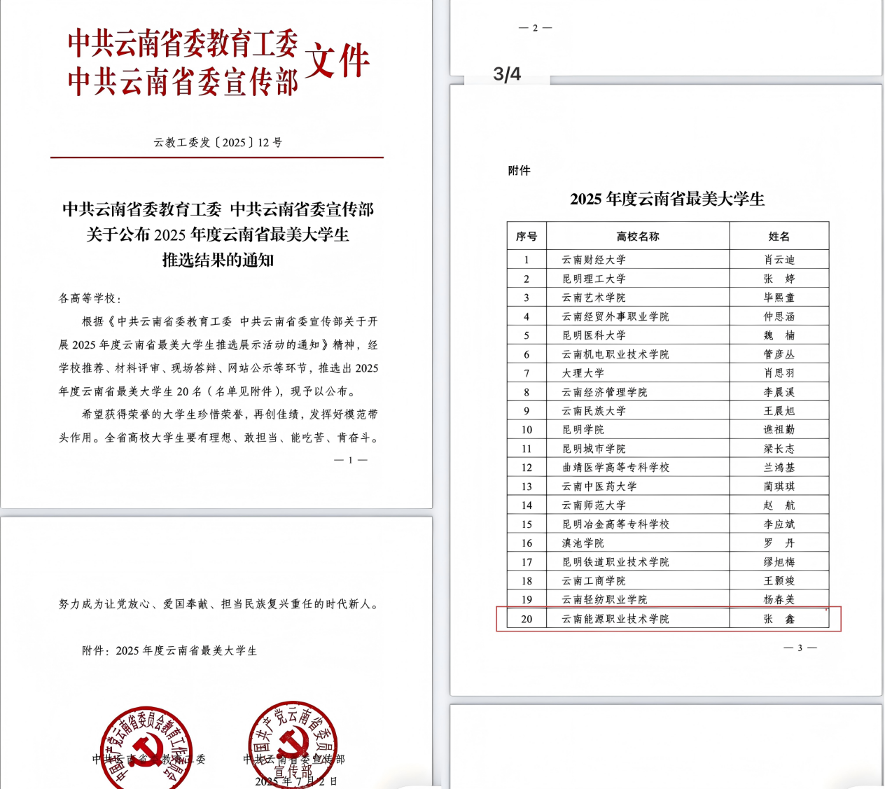 (2025年度我校学生张鑫荣获“云南省最美大学生”称号)