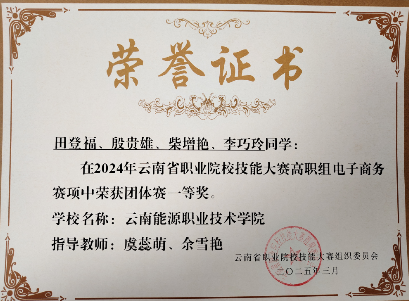 图:2024年云南省职业院校技能大赛电子商务赛项一等奖证书