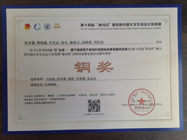 图:2024年第十四届“挑战杯”秦创原中国大学生创业计划竞赛铜奖证书
