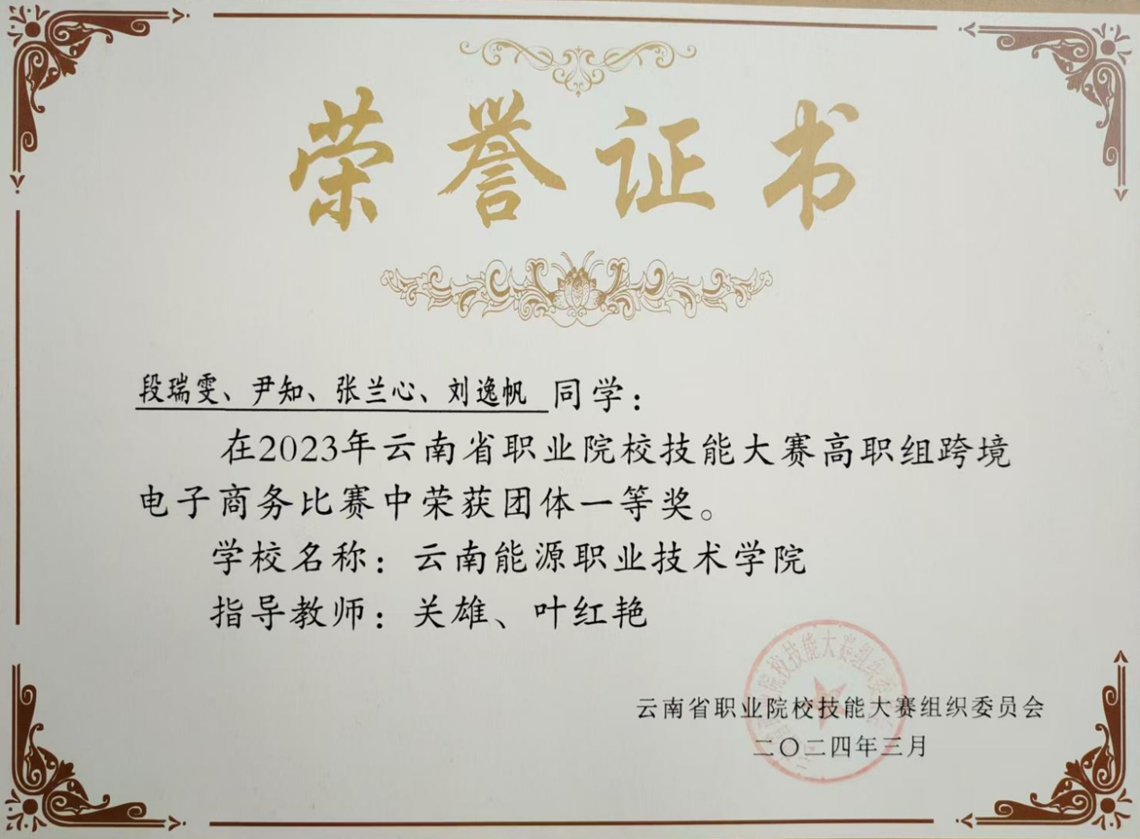 图:2023年云南省职业院校技能大赛跨境电子商务赛项一等奖证书