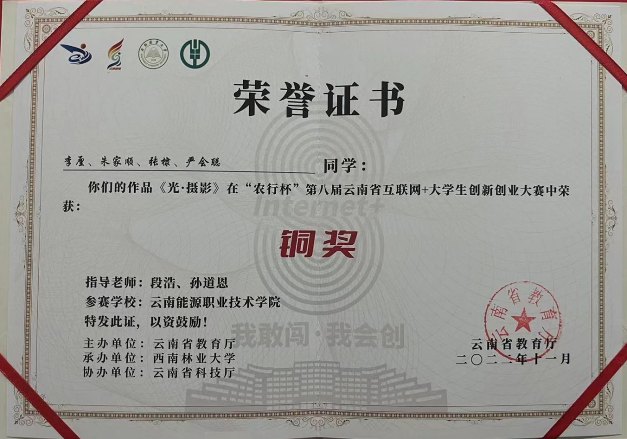 图:2022年云南省第八届互联网+创新创业大赛铜奖证书