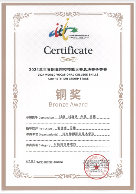 图:2024年世界职业院校技能大赛总决赛争夺赛铜奖证书